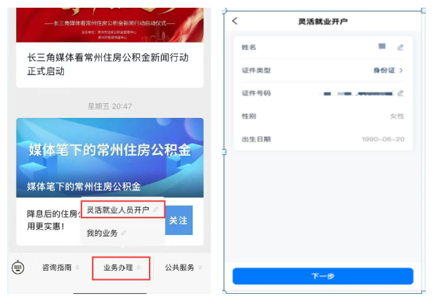 登錄“常州住房公積金”微信公眾號后,進入“業(yè)務辦理”→“靈活就業(yè)人員開戶”界面,自助辦理申請手續(xù)。