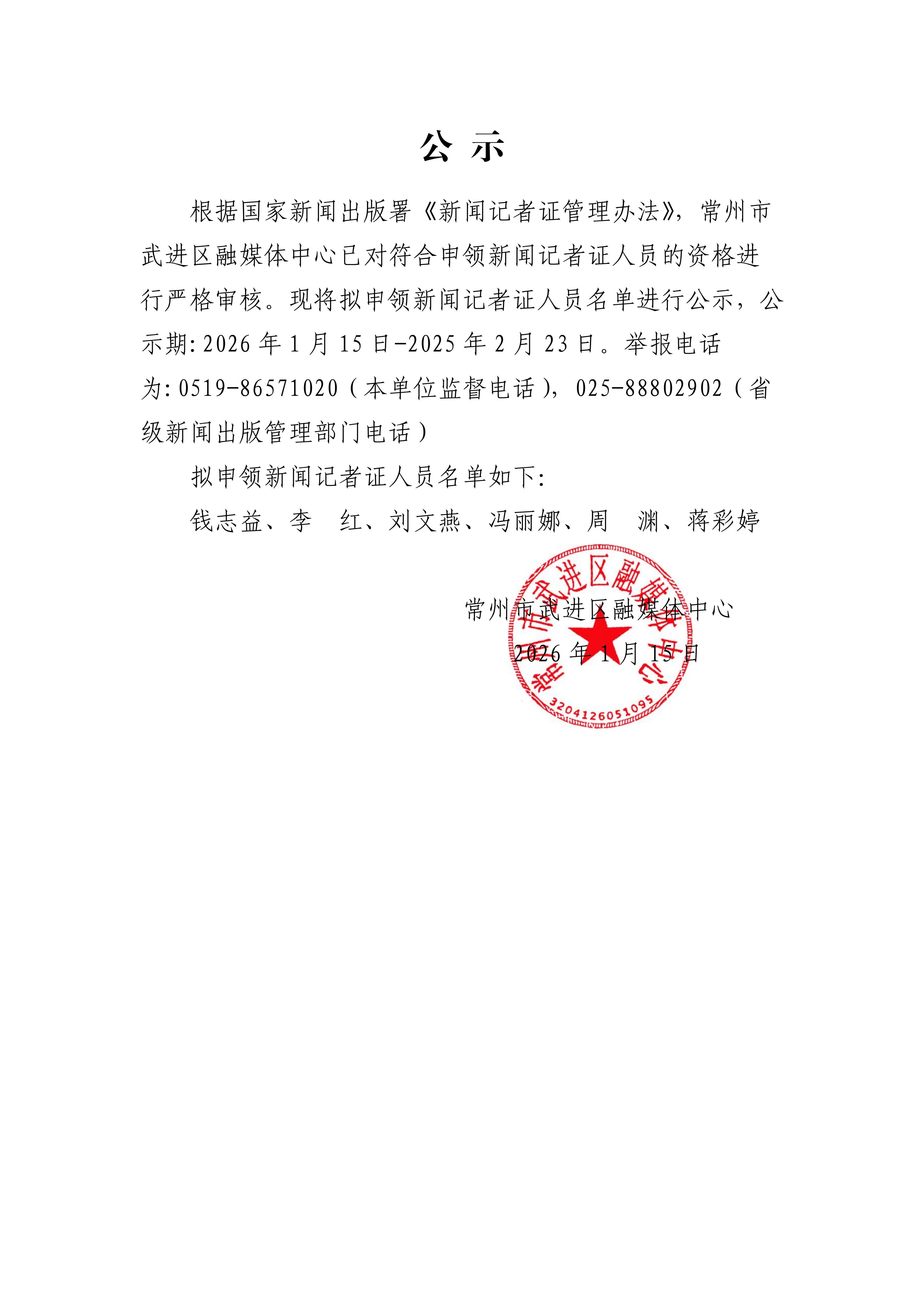 常州市武進(jìn)區(qū)融媒體中心擬申領(lǐng)新聞?dòng)浾咦C人員名單公示