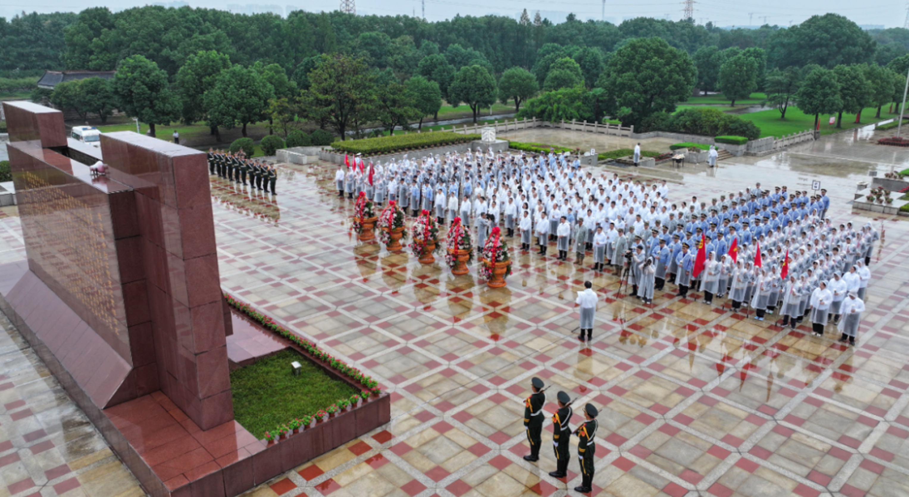 在低沉深情的《獻花曲》中,禮兵正步向前,托起花籃,緩緩走向紀念碑,將花籃整齊擺放在紀念碑基座上。全體人員肅穆靜立,行注目禮。