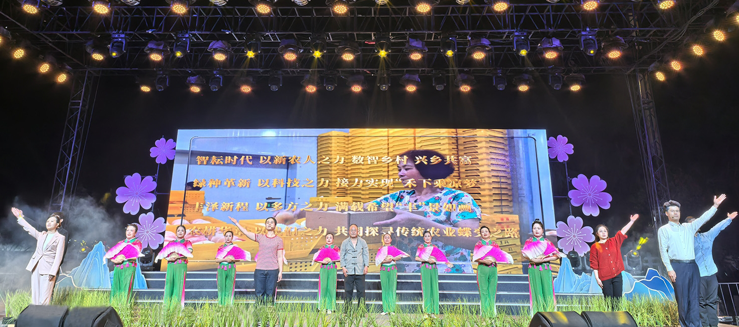 “一輪紅日,冉冉升起,驅(qū)散了田間的溟漾晨霧……”舞臺之上,光影交錯,情景劇《田間“稻”夢》緩緩拉開帷幕。作品通過以老農(nóng)民與新農(nóng)人的對話為主線,巧妙融入“夢”的敘事轉(zhuǎn)折,全面呈現(xiàn)水稻從選種、育種、種植到管理、豐收、銷售的完整產(chǎn)業(yè)鏈條。