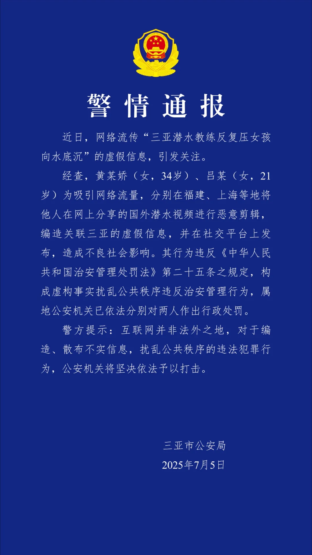 編造“三亞潛水教練反復(fù)壓女孩向水底沉”虛假信息 2人被處罰