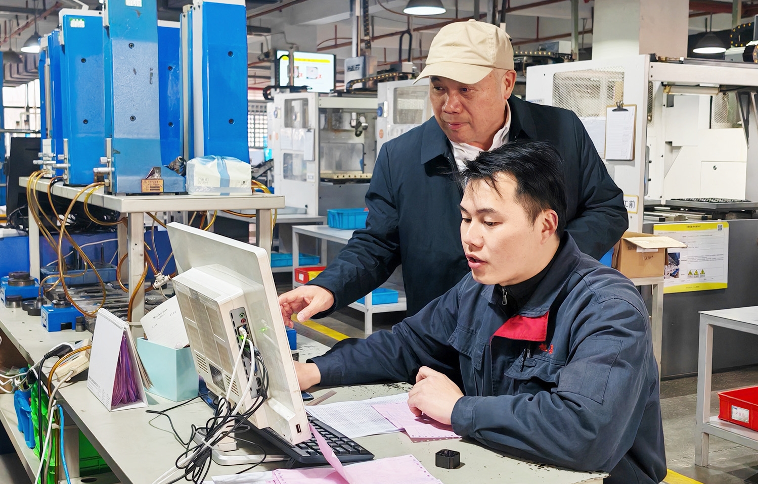 旭泉電機(jī)工人在車間討論新品研發(fā)