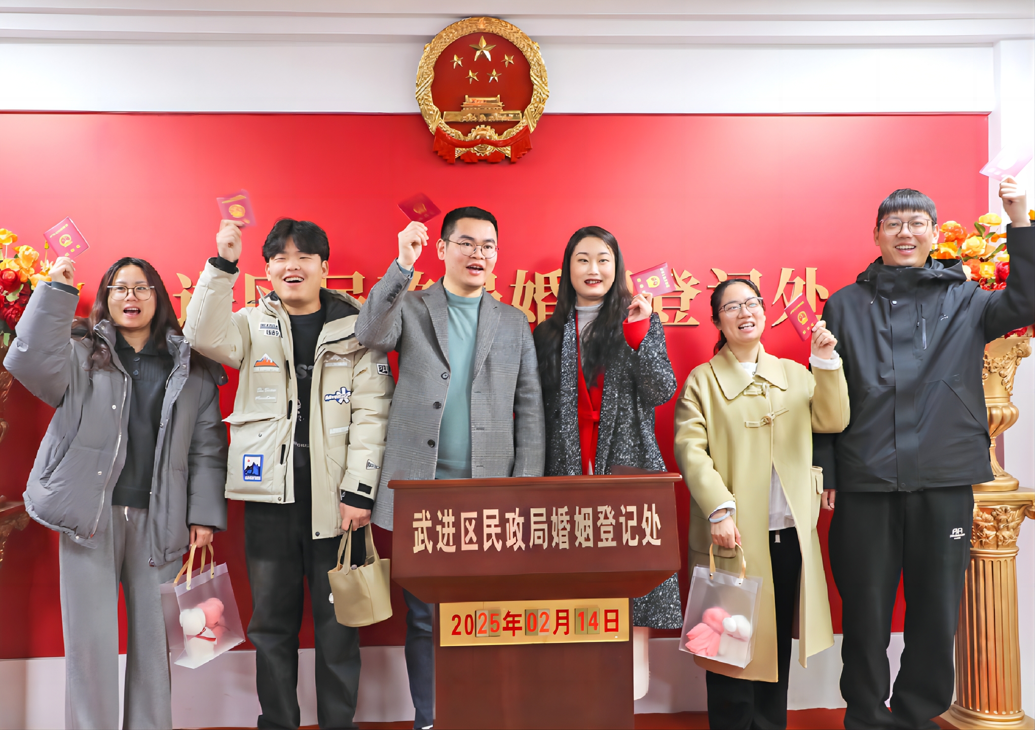 2月14日是西方情人節(jié),不少情侶選擇在這個(gè)充滿浪漫與甜蜜的日子領(lǐng)取結(jié)婚證。2月14日,區(qū)民政局婚姻登記處也迎來(lái)了登記“小高峰”。