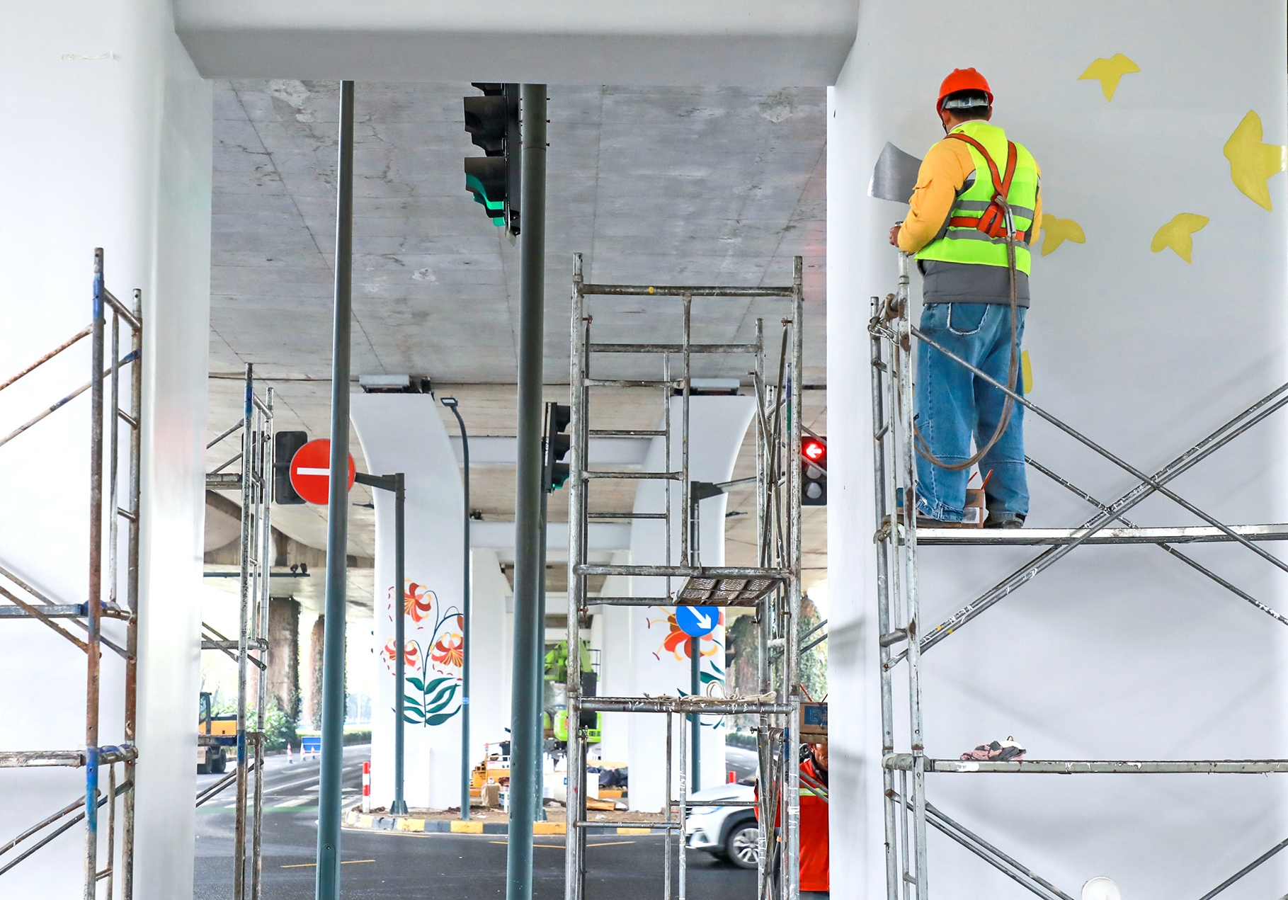 “該工程占地3500平方米,除立柱彩繪外還會進(jìn)行地面環(huán)境景觀提升,景觀帶將通過設(shè)置置石、木柵欄以及耐陰綠植,打破原有單一色帶的綠化局面,增加空間靈動性。”江蘇恒諾農(nóng)業(yè)科技發(fā)展有限公司技術(shù)員劉凱告訴記者,項目預(yù)計在本月中旬全部完工。
