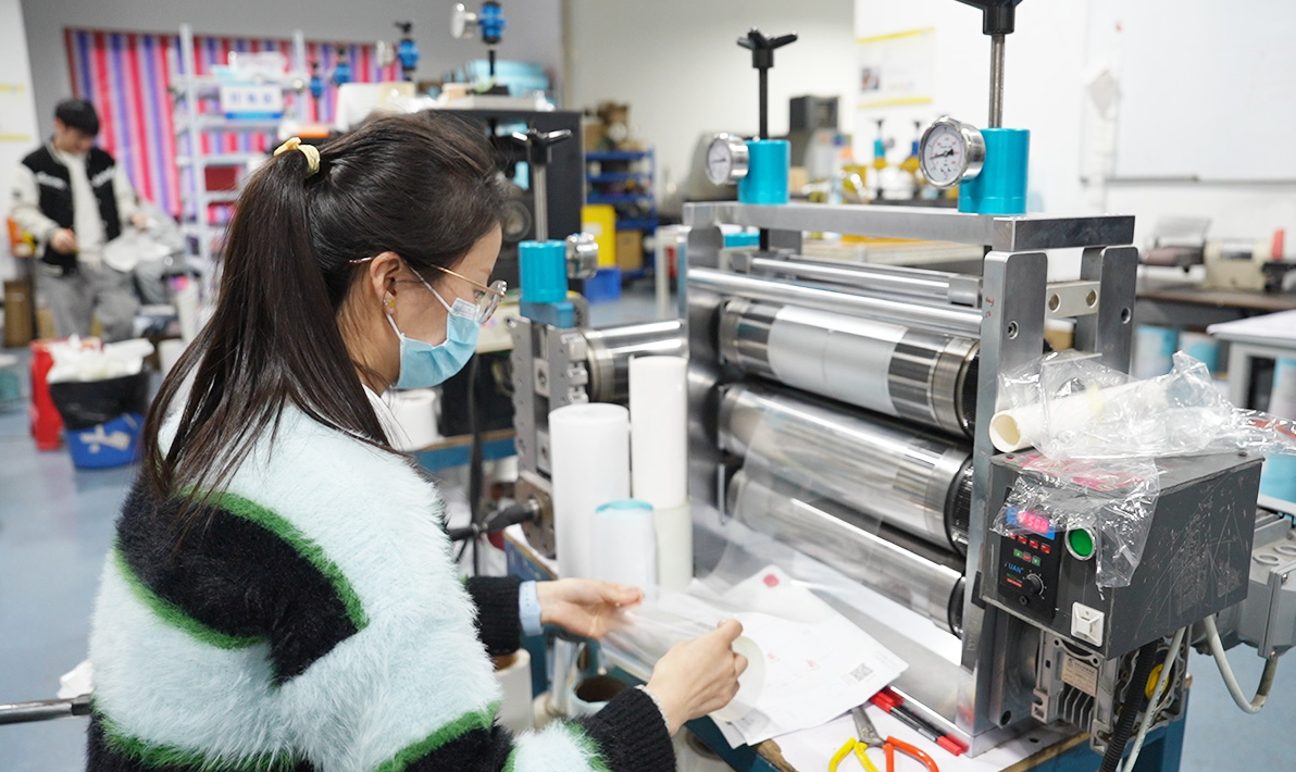 企業(yè)技術(shù)總監(jiān)左帥從底紙上輕松取下裁切后的標(biāo)簽,查看邊緣是否清晰,底紙是否破損。“結(jié)合客戶對標(biāo)簽的具體要求和寄來的不干膠材料,我們?yōu)槠涠ㄖ朴糜谥谱鞑桓赡z標(biāo)簽的刀具、底輥、模切單元等產(chǎn)品,通過不斷驗證,確保產(chǎn)品完美交付,助力客戶進(jìn)行大規(guī)模連續(xù)性貼標(biāo)工作。”左帥介紹。