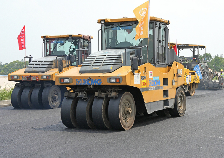 中午11:30,施工現(xiàn)場(chǎng)一派繁忙景象。記者看到,熾熱的瀝青混合料從2臺(tái)攤鋪機(jī)中傾瀉而下,其溫度高達(dá)170℃以上。緊接著,7臺(tái)壓路機(jī)有序跟進(jìn),輪番對(duì)路面進(jìn)行初壓、復(fù)壓和終壓,確保瀝青面層密實(shí)平整。