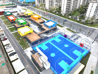 “潮盒A7”位于永勝中路與新騰路交會(huì)處,地處淹南片區(qū)核心區(qū)域,以“彩色集裝箱”為建筑語言,由9個(gè)集裝箱組合而成,造型新穎獨(dú)特。籃球場作為淹南片區(qū)重要的公共運(yùn)動(dòng)場所,填補(bǔ)了專業(yè)運(yùn)動(dòng)場地的空白,開放時(shí)間為每日1000至2100,便于居民在“家門口”參與體育鍛煉。
