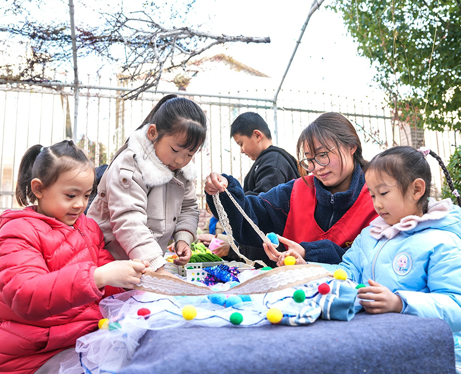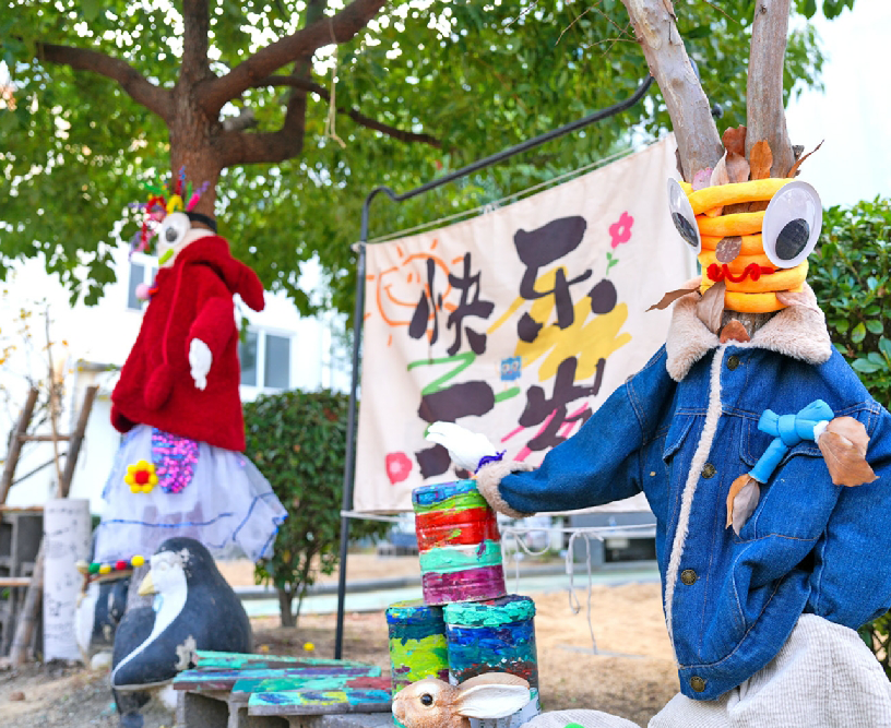 武進(jìn)國(guó)家高新區(qū)十里社區(qū)的“我給大樹(shù)穿新衣”現(xiàn)場(chǎng)也熱鬧非凡。李公樸幼兒園十里園區(qū)的孩子們和社區(qū)志愿者一起開(kāi)動(dòng)腦筋,分工協(xié)作,將家中舊物“變廢為寶”。毛線、布料在巧手中被編織、裁剪成充滿奇思妙想的“自然藝術(shù)品”,不僅裝點(diǎn)了樹(shù)木,更讓資源循環(huán)利用的理念在互動(dòng)中生根發(fā)芽。