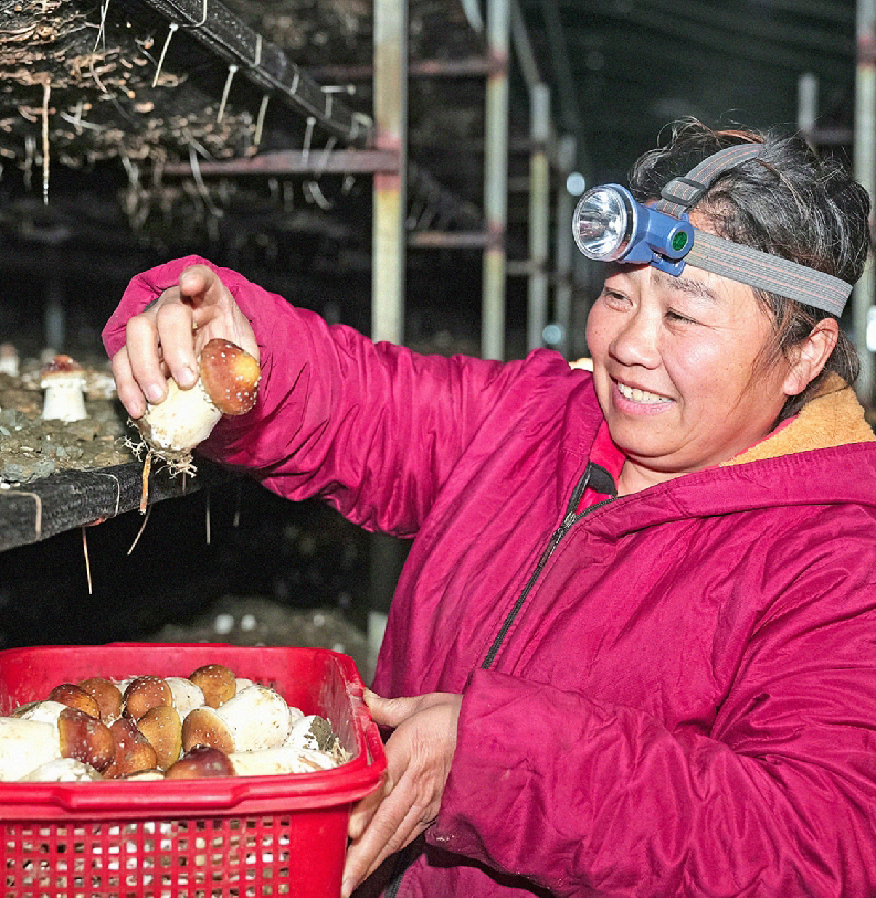 走進周莊村菌菇種植基地,大棚內(nèi)暖意融融。由稻草、木屑等混合制成的基質(zhì)上,一簇簇赤松茸破“草”而出,圓潤的菌蓋緊緊裹著潔白粗壯的菌柄,猶如一個個藏在草叢里的小精靈,長勢十分喜人。技術(shù)員們正熟練地將鮮菇放入筐中。