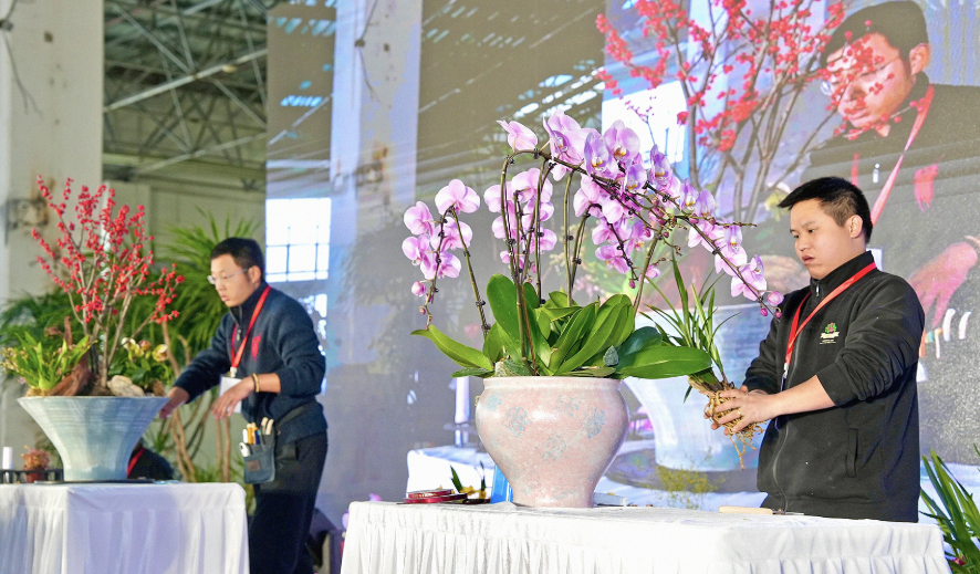 活動當天,夏溪年宵花大集同步開幕,蝴蝶蘭、大花蕙蘭、北美冬青、紅玉珠等近百種時令花卉集中亮相。與此同時,“年宵花組合盆栽創(chuàng)意PK賽”火熱舉行,來自溧陽花茶坊、杭州新紫竹等花藝機構(gòu)的選手圍繞春節(jié)主題進行限時創(chuàng)作,將傳統(tǒng)花材與現(xiàn)代設計理念巧妙融合,呈現(xiàn)出一盆盆寓意吉祥、造型新穎的作品。比賽不僅成為花藝師展示技藝的舞臺,更吸引了大量觀眾駐足欣賞與交流,部分設計作品甚至在現(xiàn)場即達成了合作與采購意向,實現(xiàn)了“展、賽、銷”的有機聯(lián)動。