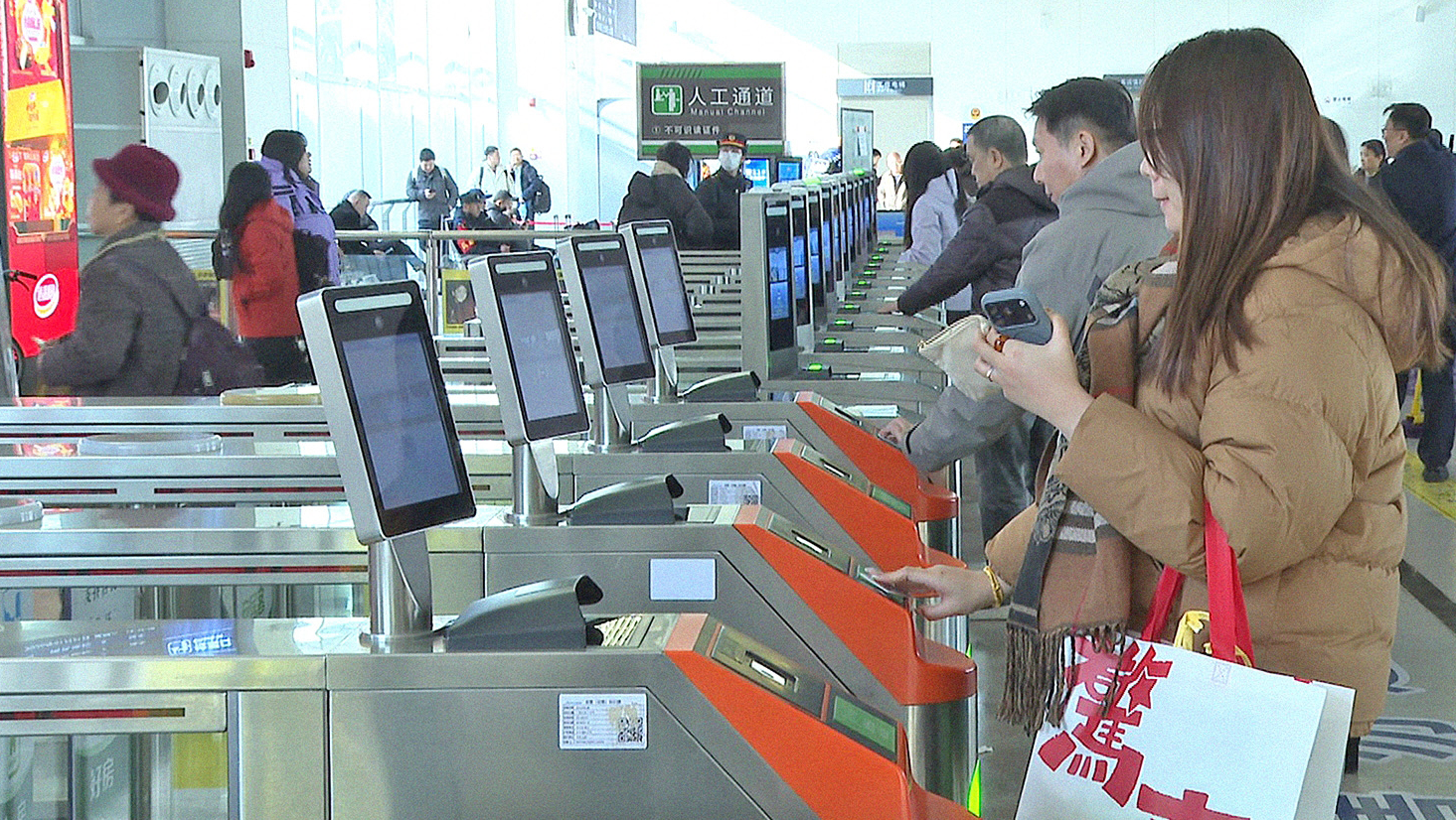 旅客在鐵路候車(chē)廳刷身份證進(jìn)站