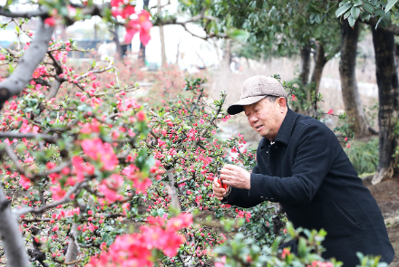 素有“花中貴妃”美譽的貼梗海棠,花梗極短、花朵緊貼枝干,鮮紅的花苞寓意著富貴吉祥、堅韌奮進(jìn),恰逢年關(guān)擺放家中,既應(yīng)景又添喜氣,是張奎方精心挑選的“感恩禮”。作為人居環(huán)境整治的直接受益人,家住漕溪村的張奎方?jīng)]有只顧著經(jīng)營自己的海棠園,而是將這份感激化作實實在在的心意,用自家培育的海棠花,向默默奉獻(xiàn)的基層工作者致敬。