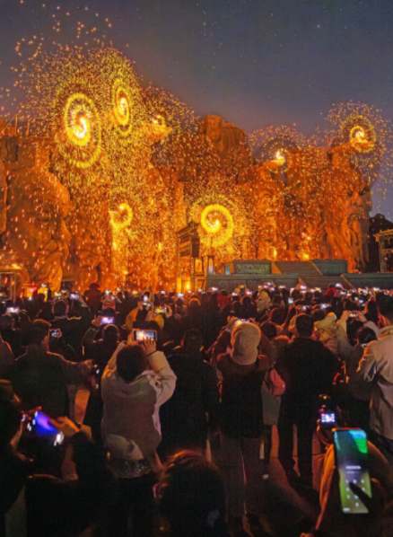 夜幕低垂,流光溢彩。非遺自貢孔雀燈迎來全國首秀,千年彩燈工藝在江南夜空華美綻放,每一幀都是東方美學(xué)的極致表達(dá);規(guī)模空前的非遺打鐵花在護(hù)城河畔璀璨登場(chǎng),萬千金花如流星雨般傾瀉而下,在驚嘆聲中再現(xiàn)“東風(fēng)夜放花千樹”的盛景。百名演員手持魚燈組成的巡游隊(duì)伍迤邐而行,仿佛將《山海經(jīng)》的奇幻世界搬入現(xiàn)實(shí),游客在光影交錯(cuò)中觸摸神話的溫度。此外,“集五福贏好禮”等互動(dòng)活動(dòng)更是讓歡聲笑語填滿園區(qū)的每一個(gè)角落。
