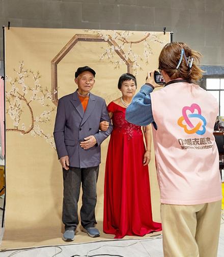 活動(dòng)現(xiàn)場,最動(dòng)人的場景莫過于一對對金婚夫婦的拍攝瞬間。胡建華和潘岳清結(jié)婚已經(jīng)51年,當(dāng)年結(jié)婚時(shí)沒有拍過照片。當(dāng)天,潘岳清穿上筆挺的西裝,胡建華披上潔白的婚紗,兩位老人站在鏡頭前,潘岳清輕輕握住了老伴的手。攝影師示意他們靠近一些,潘岳清有些不好意思地往老伴身邊挪了挪,胡建華則笑著挽住了他的胳膊。“潘師傅,今天真帥!”現(xiàn)場工作人員的打趣,引得大家哈哈大笑??扉T聲中,那份歷經(jīng)歲月沉淀而愈發(fā)醇厚的溫情被永久珍藏。