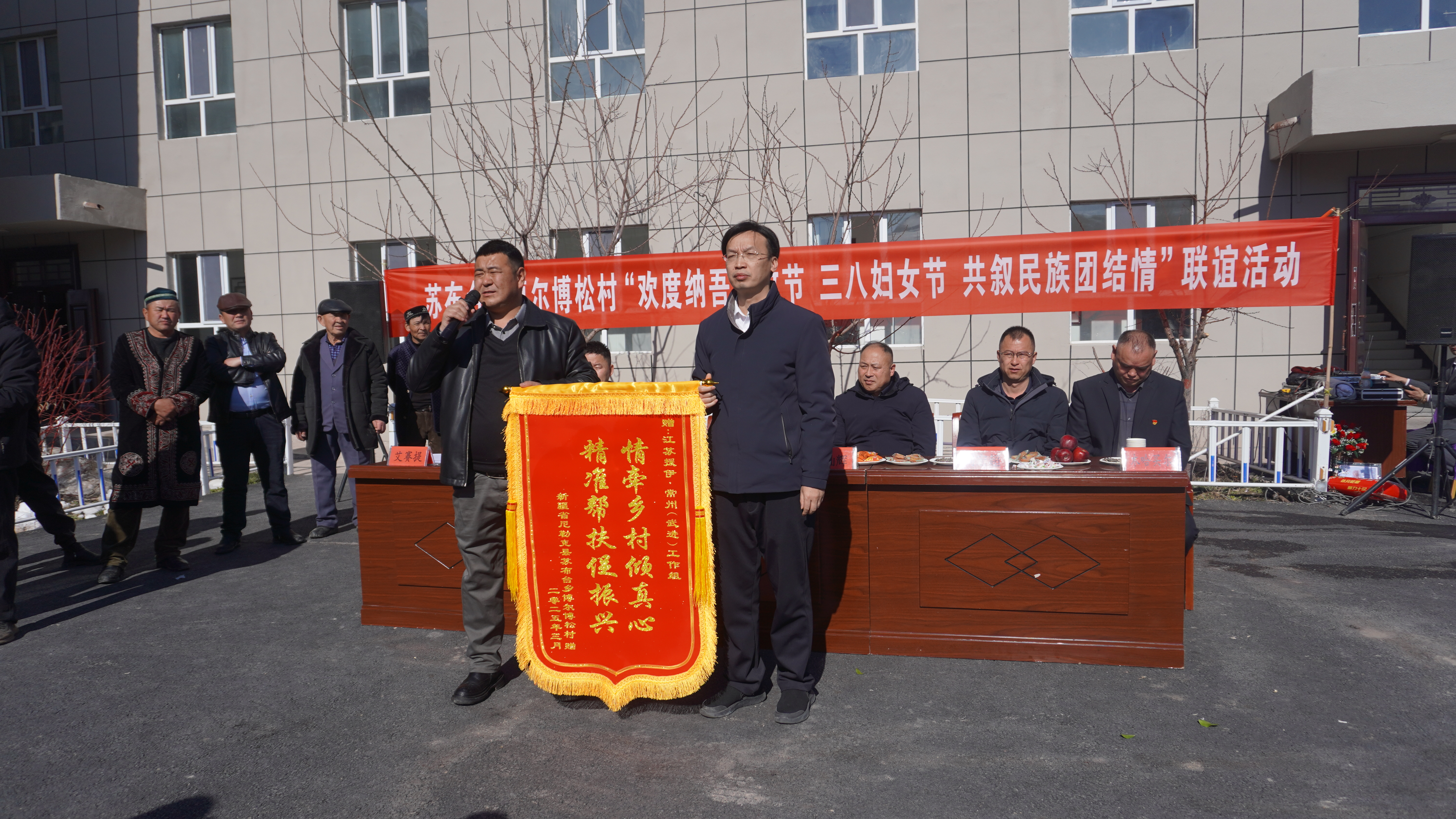在喜慶的活動氛圍中,村委還為村里金婚、銀婚的夫婦送上了結婚紀念照,并為武進工作組送上了致謝錦旗。據悉,過去一年里,在武進工作組的支援下,博爾博松村不僅解決了路燈照明問題、貧困戶就業(yè)難題,更是發(fā)展起駱駝養(yǎng)殖、柯賽繡等特色產業(yè),共同奏響鄉(xiāng)村振興“共富曲”。武進區(qū)委常委、尼勒克縣委副書記、江蘇援伊·常州(武進)工作組組長賈東表示,此次活動展現(xiàn)了民族團結的深厚情誼,工作組未來還將繼續(xù)深化對口支援工作,推動當地經濟社會發(fā)展,促進民族團結,共同邁向更加美好的未來。