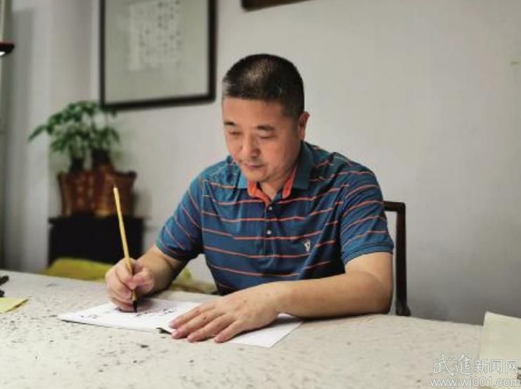 徐勇的書法工作室地處武進(jìn)鬧市,鬧中取靜,獨(dú)辟一方天地。走進(jìn)其中,墨香縈繞,靜謐雅致,牌匾上書“修竹草堂”四字。墻上掛有各色書法作品和拓本,可謂歲月生香、處處留印。