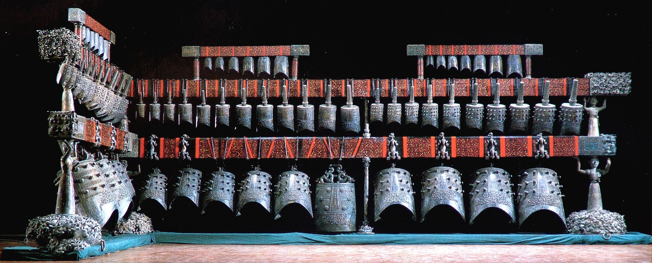 更為神奇的是,一般物體只能發(fā)出一個樂音,但是編鐘的每件鐘都能發(fā)出兩個樂音,并且互不干擾。在2000多年前就有如此精美的樂器,這在世界文化史上是極為罕見的。而這件一錘雙音、驚艷世界的樂器,從出土至今只奏響過3次。第一次奏響是在1978年8月1日,曾侯乙編鐘原件演奏音樂會在駐隨炮師某部禮堂舉行。這是沉寂了2400多年的曾侯乙編鐘,重新向世人發(fā)出它那雄渾而又浪漫的千古絕響。首次奏響編鐘以《東方紅》為開篇,歷經(jīng)兩小時多,最后以《國際歌》樂曲落幕。第二次奏響是在1984年,為慶祝新中國成立35周年,在北京中南海懷仁堂演奏了中國古曲《春江花月夜》、創(chuàng)作曲目《楚殤》以及《歡樂頌》等中外名曲。第三次奏響是在1997年,著名音樂人譚盾為慶祝香港回歸創(chuàng)作大型交響樂《交響曲1997:天·地·人》時,由國家特批再次敲響了編鐘。