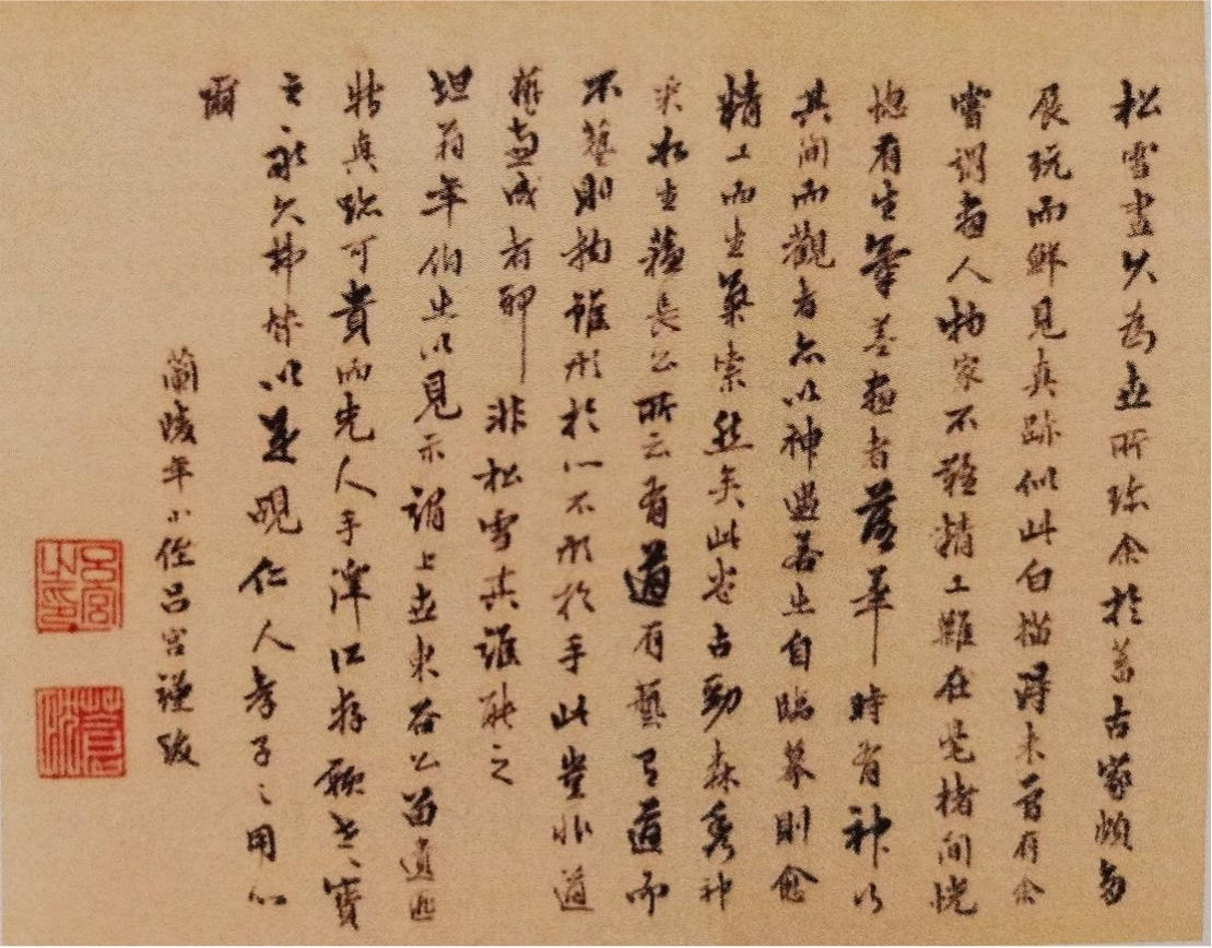 從文獻及史學(xué)角度而言,該畫卷及題跋異常珍貴,不僅在于畫作本身很可能出自趙孟頫之手,更有意思的是,楊廷鑒是明朝最后一個狀元,與呂宮同為武進人,而且還是連襟。該畫卷題跋是目前惟一存世且一紙同體地呈現(xiàn)了明清兩代兩位武進狀元書法風(fēng)采的作品,從中更可管窺二人的文藝取向與精神世界,值得后人惜之、寶之。