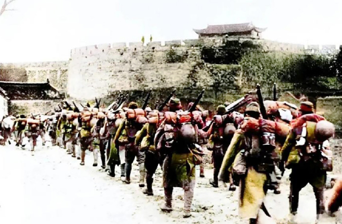 ▲經(jīng)過一天激戰(zhàn),常州全境淪陷。全副武裝的日軍列隊進(jìn)入常州城。