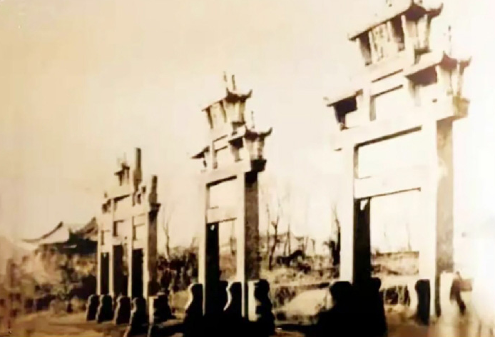 ▲青果巷附近的一座古牌坊,鏡頭里出現(xiàn)兩名日本軍人。
