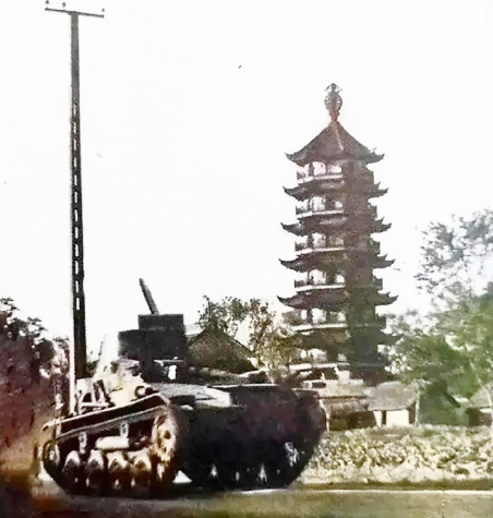 ▲當(dāng)時的文筆塔。日軍在這里擺了一輛坦克合影。文筆塔有1500多年歷史,最早名為“太平講寺塔”,后為了彰顯常州文脈興盛,改名為文筆塔。
