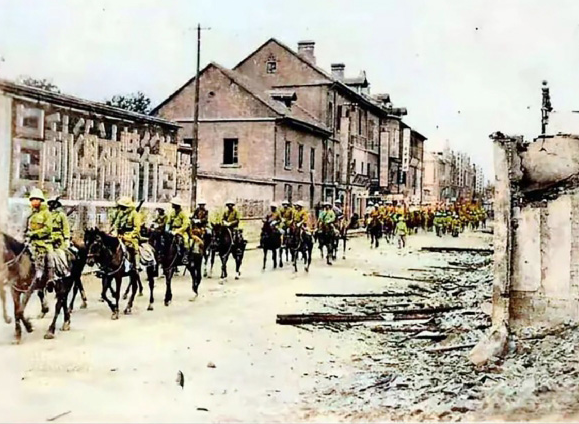 ▲日軍騎兵聯(lián)隊在街上行進(jìn),兩側(cè)是被他們摧毀的建筑。