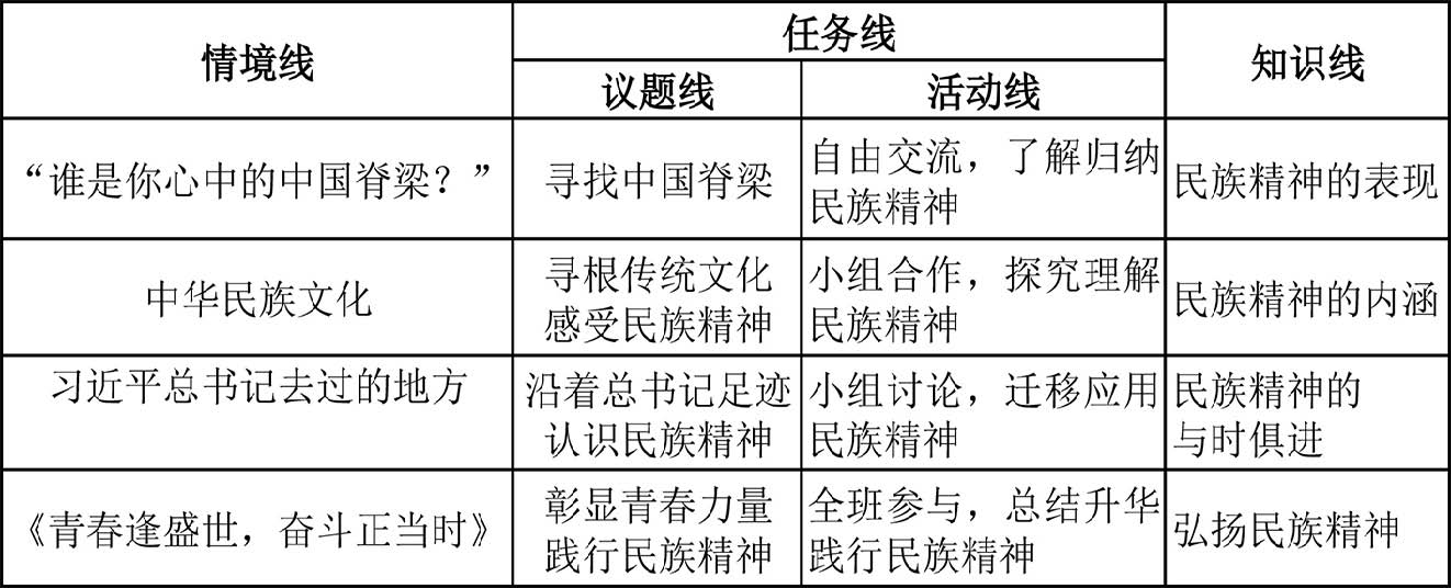從情境線、任務(wù)線和知識線三條線的組織上看,首先以微博話題作為情境引入,生動且貼近生活,調(diào)動學(xué)生已有經(jīng)驗銜接知識,柔化了民族精神的剛性話題,為后續(xù)內(nèi)容做好了準備;其次設(shè)計了在中華傳統(tǒng)文化中感悟民族精神的環(huán)節(jié),這里需要學(xué)生展現(xiàn)一定的語文素養(yǎng)來理解相關(guān)內(nèi)涵,活化知識的同時,以“他山之石”攻玉,實現(xiàn)了跨學(xué)科協(xié)同育人的一體化;接著,在沿著總書記的足跡這一部分中,在介紹習(xí)近平總書記走過的地方和這些地方所凝聚的民族精神,要求學(xué)生合作思考在新時期弘揚民族精神的意義,在理解的基礎(chǔ)上進一步內(nèi)化知識;最后全班參與詩朗誦,由內(nèi)在知識走向外向行為,在遷移知識中進一步總結(jié)升華。