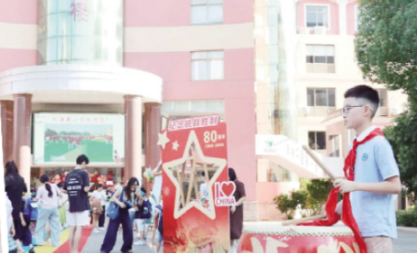 星河實(shí)驗(yàn)小學(xué)門口成了一片醒目的“紅色海洋”。學(xué)生們化身“小小追夢(mèng)人”,用創(chuàng)意服裝完成特別“變身”:有的身著迷彩服,眼神堅(jiān)毅如小戰(zhàn)士;有的手持紙筆,扮成懷揣文學(xué)夢(mèng)的小作家;有的穿白大褂、戴聽診器,模仿醫(yī)護(hù)人員;還有的以“小科學(xué)家”造型亮相,立志探索科學(xué)奧秘……“我扮的是聶耳,他寫的《義勇軍進(jìn)行曲》超有力量。”二年級(jí)學(xué)生陳諾驕傲地展示衣角的白鴿徽章,“這代表和平,我希望世界永遠(yuǎn)沒有戰(zhàn)爭。”稚嫩話語里滿是對(duì)英雄的崇敬。