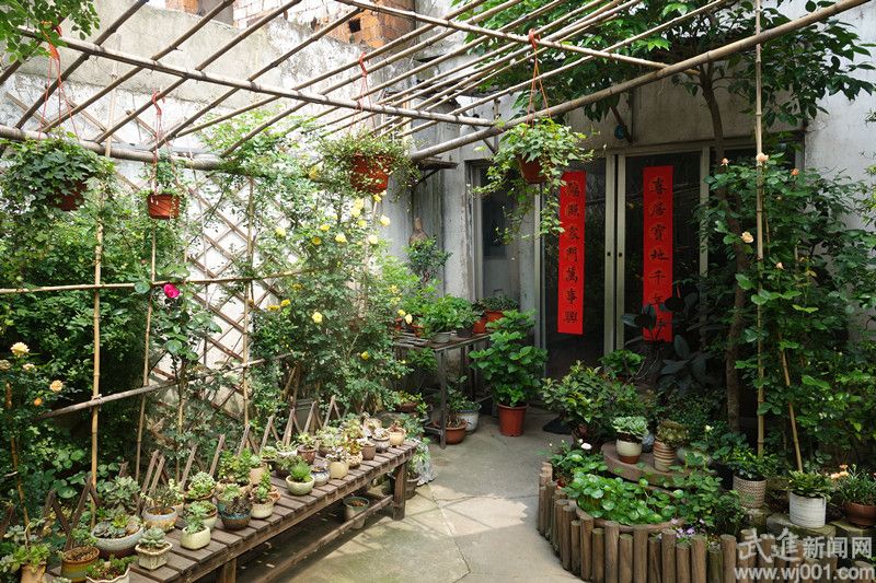 庭院的角角落落里,還散陳著一些石鎖、石秤砣、石磨盤等,都是主人從外面收來的。主人還在庭院內(nèi)用竹子搭了個(gè)天棚,吊了常春藤、綠蘿等植物,養(yǎng)了幾盆青蓮,人行走、穿梭于庭院中,時(shí)有鳥兒在此鳴叫,仿佛進(jìn)入花鳥園。