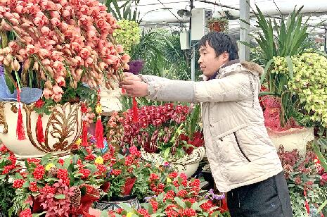 走進(jìn)國龍園藝,2000多平方米的門店,上百種花卉競相開放,前來選購年宵花的市民絡(luò)繹不絕,店員們也都忙著備貨。“中國人過年就喜歡喜慶,紅色是春節(jié)的代表顏色,也是營造新春氛圍的‘一把手’,因此,寓意好的紅色花卉繼續(xù)成為今年的爆款。”店長鄒鎮(zhèn)水指著擺放在店中央的富貴籽說,“你看那小小的珠子在大片綠葉的襯托下多好看,無論是外表還是名字,都顯得很貴氣。”鄒鎮(zhèn)水告訴記者,為了迎合過年氣氛,他們特意將富貴籽編織成燈籠狀,在上面掛上中國結(jié),還配以形狀各異的花盆,剛上市就受到了很多顧客的青睞,日銷售量上百盆。