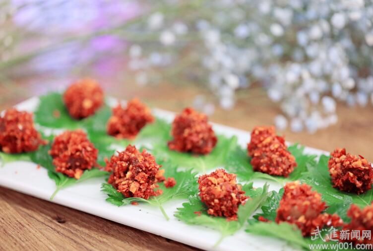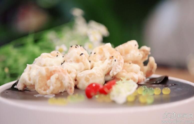 這是一道中西結合的大菜,選用基圍蝦做主材,經(jīng)過秘制醬料腌漬后,裹上沙拉醬。而這道菜最特別之處是使用了芥末,吃起來有一絲絲辣味,特別爽口。奶濃蝦香,顏值美味俱在線,叫人無法抗拒。